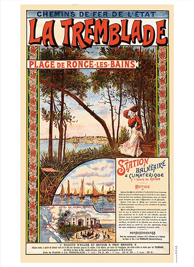 Contrairement à Royan, la plage de la Cèpe, à Ronce-les-Bains est moins centrée sur les activités mondaines. Bien au contraire, on y vient pour son climat tempéré, bon pour la santé, sa douceur de vivre et des pratiques proches de la nature, voile, pêche ou chasse par exemple. Avec son décor floral, cette affiche peut être classée dans l’Art nouveau.